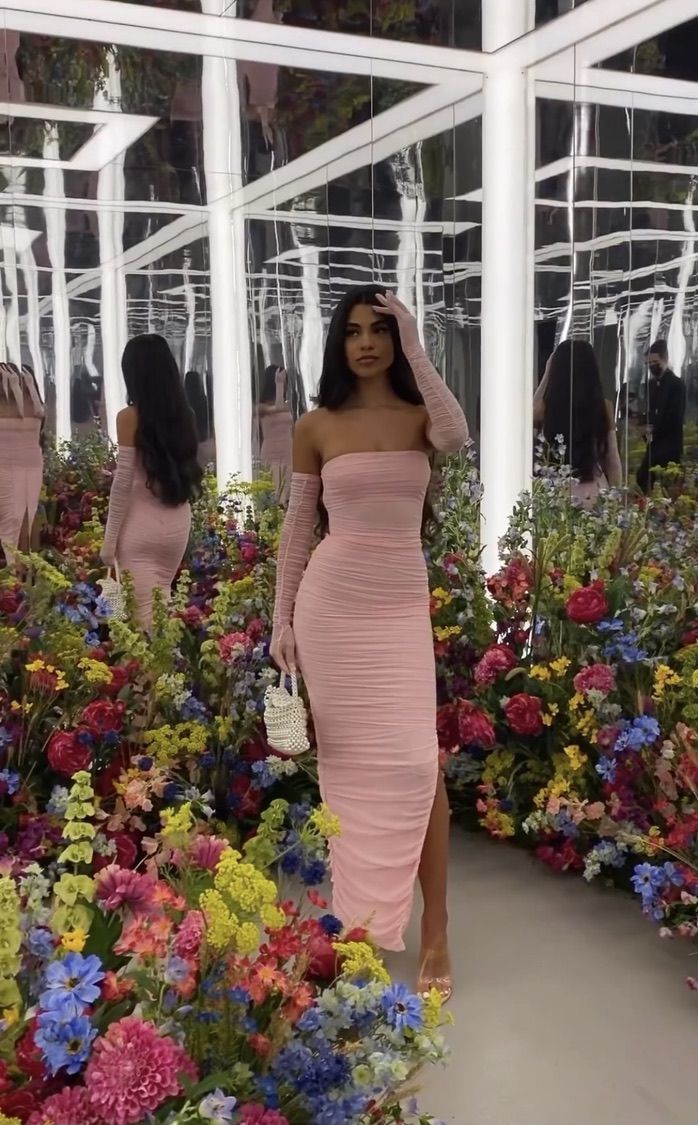 Robe de soirée longue rose bustier fendue, robe d'invitée de mariage, D217