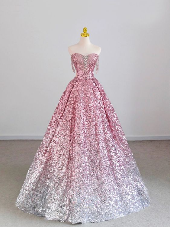 Robe de bal longue rose à paillettes, coupe trapèze, décolleté en cœur, MD7370