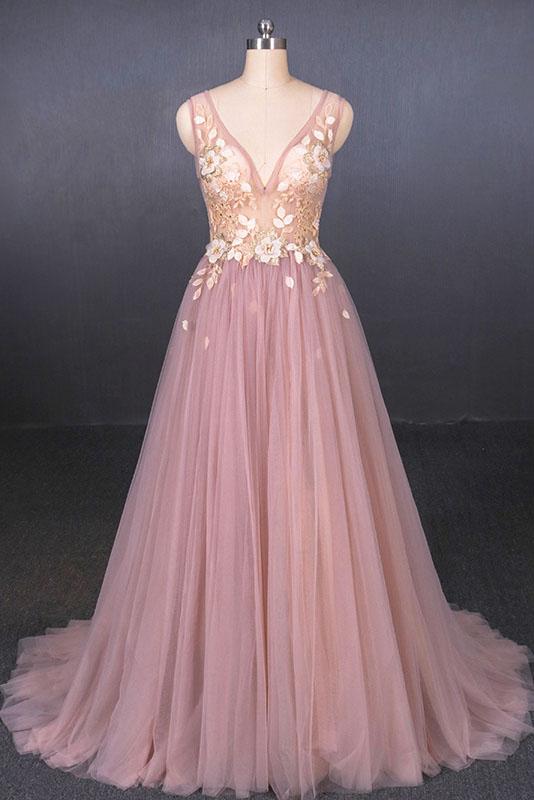 Robe de bal rose en tulle sans manches, col en V et appliqués, robe de soirée trapèze en tulle M1854