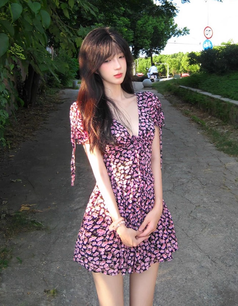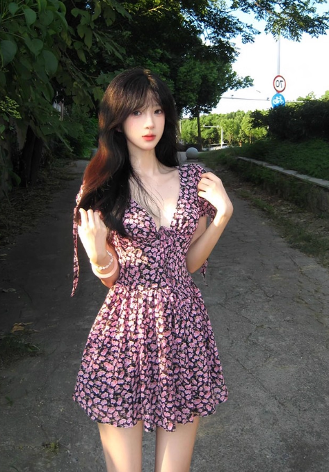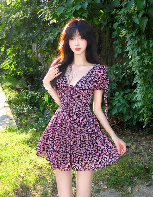 Jolie robe d'été trapèze à lacets et col en V avec jupe courte florale pour femme D1934