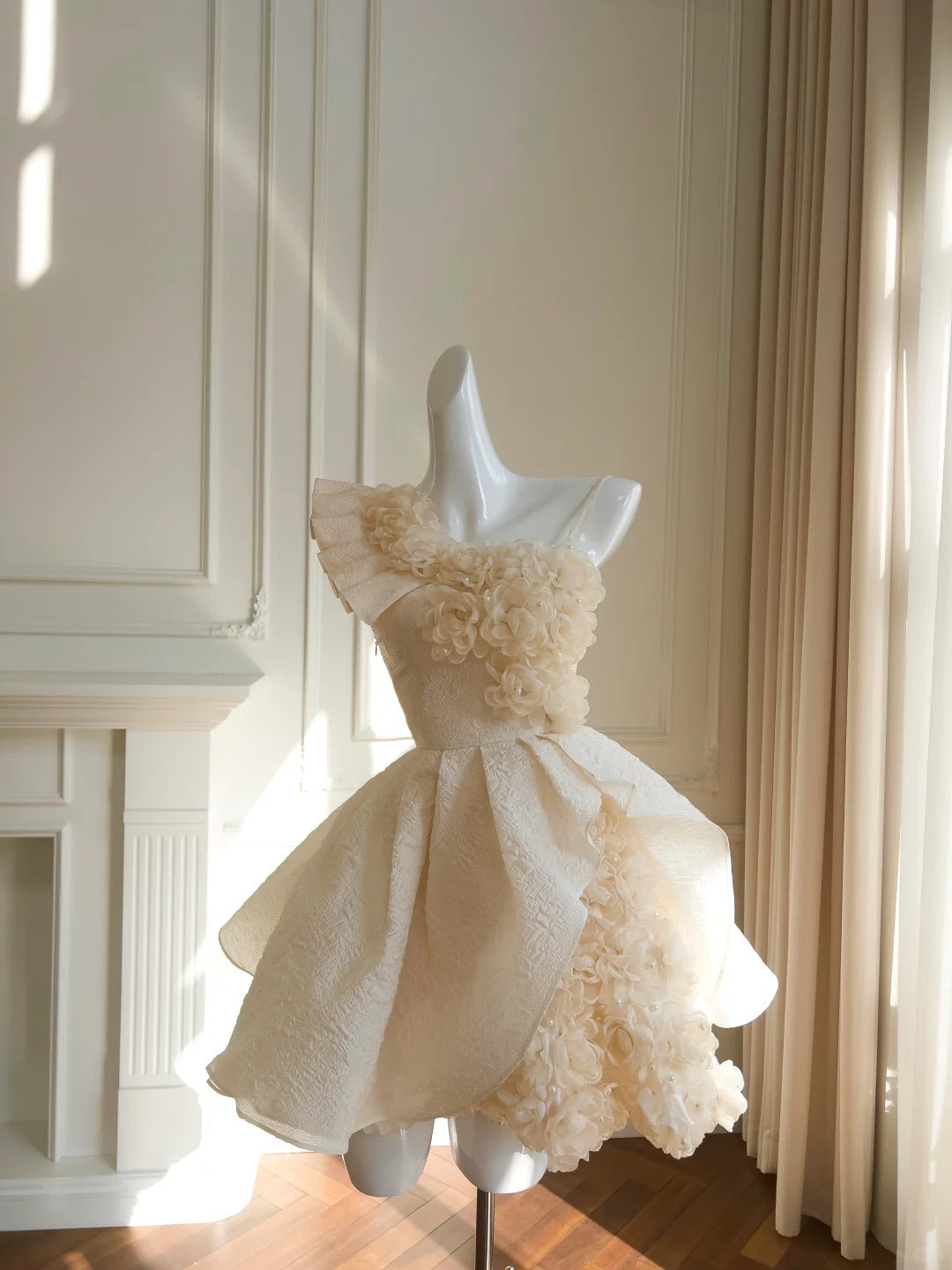 Robe de bal courte à décolleté asymétrique, plissée, fleurie, à volants et perles, pour les 16 ans, D1871