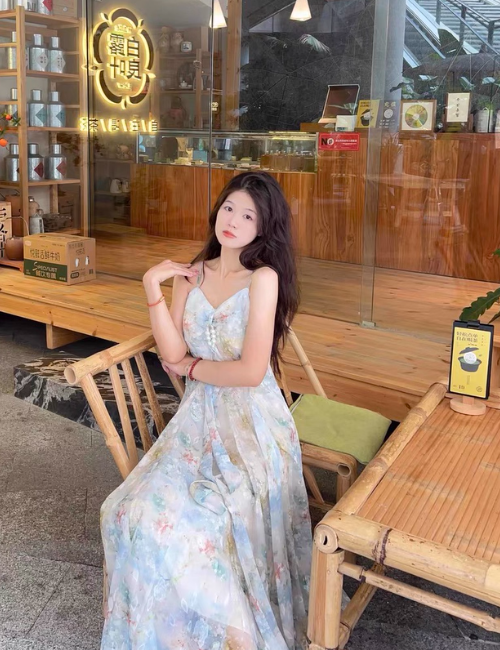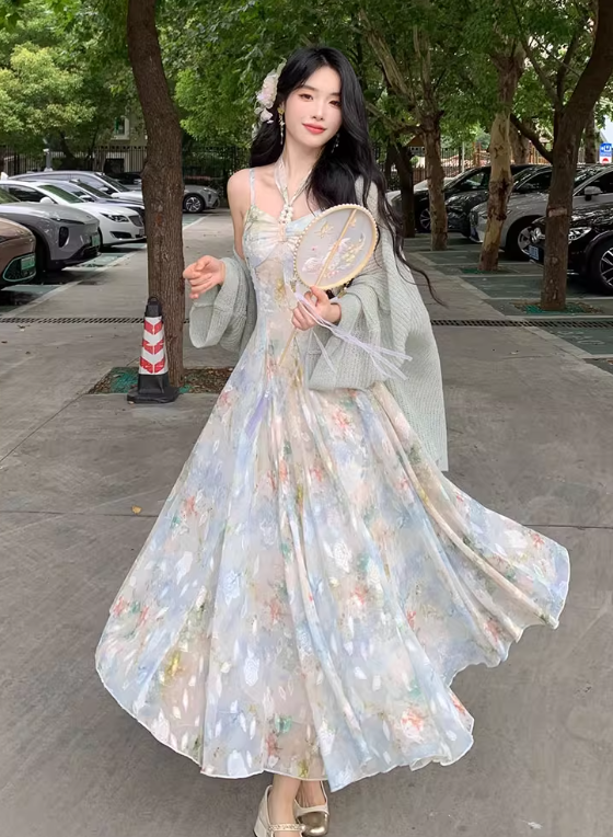 Jupe longue plissée style peinture à l'huile, col licou, pour femme, tenue de vacances, d'été, de bord de mer, D1995