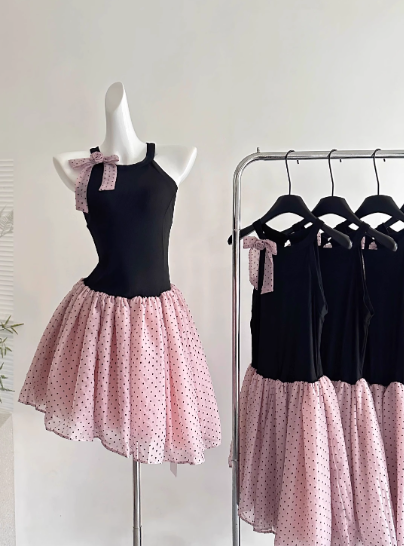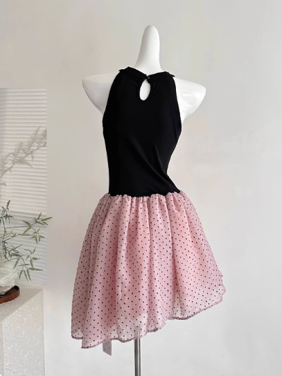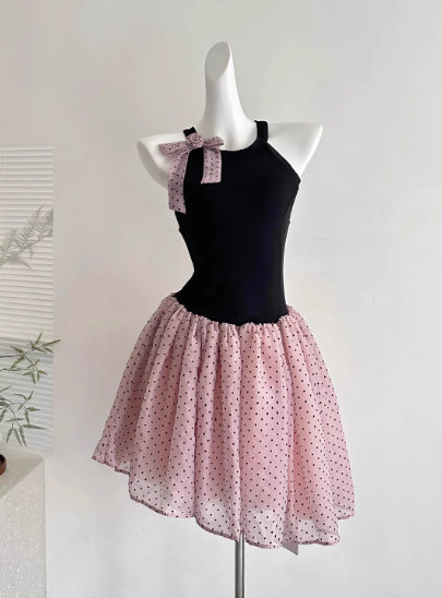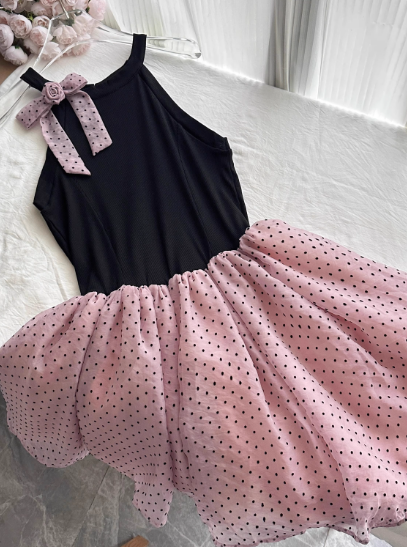 Jolie robe d'été en tulle plissé à pois et col licou avec nœud papillon rose pour femme, tenue de rendez-vous D1901