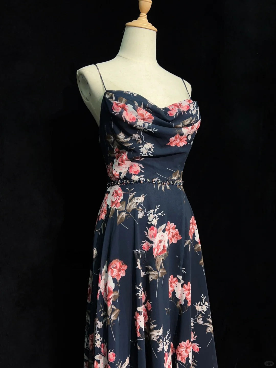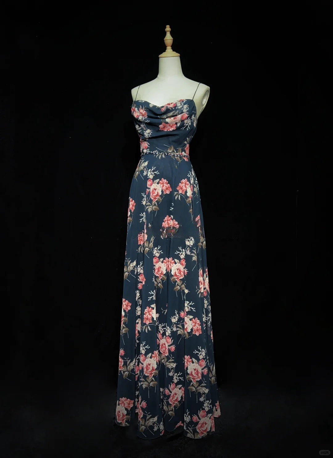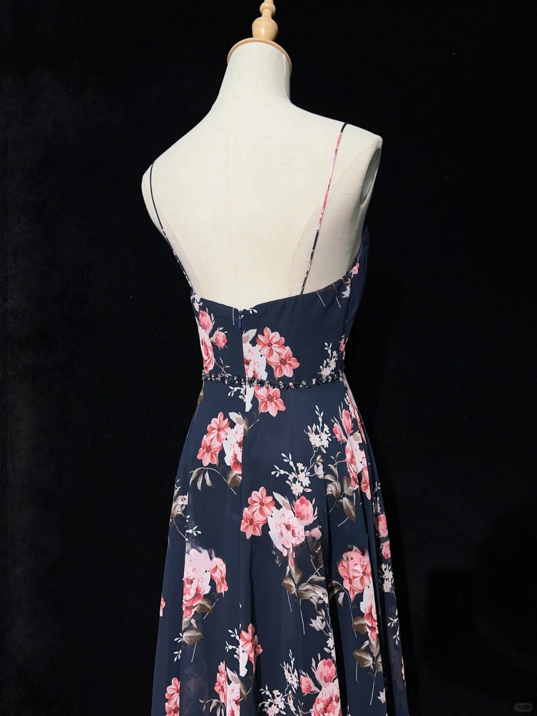 Jolie robe de bal à bretelles spaghetti, dos nu, imprimée, robe de gala, robe de soirée D2598
