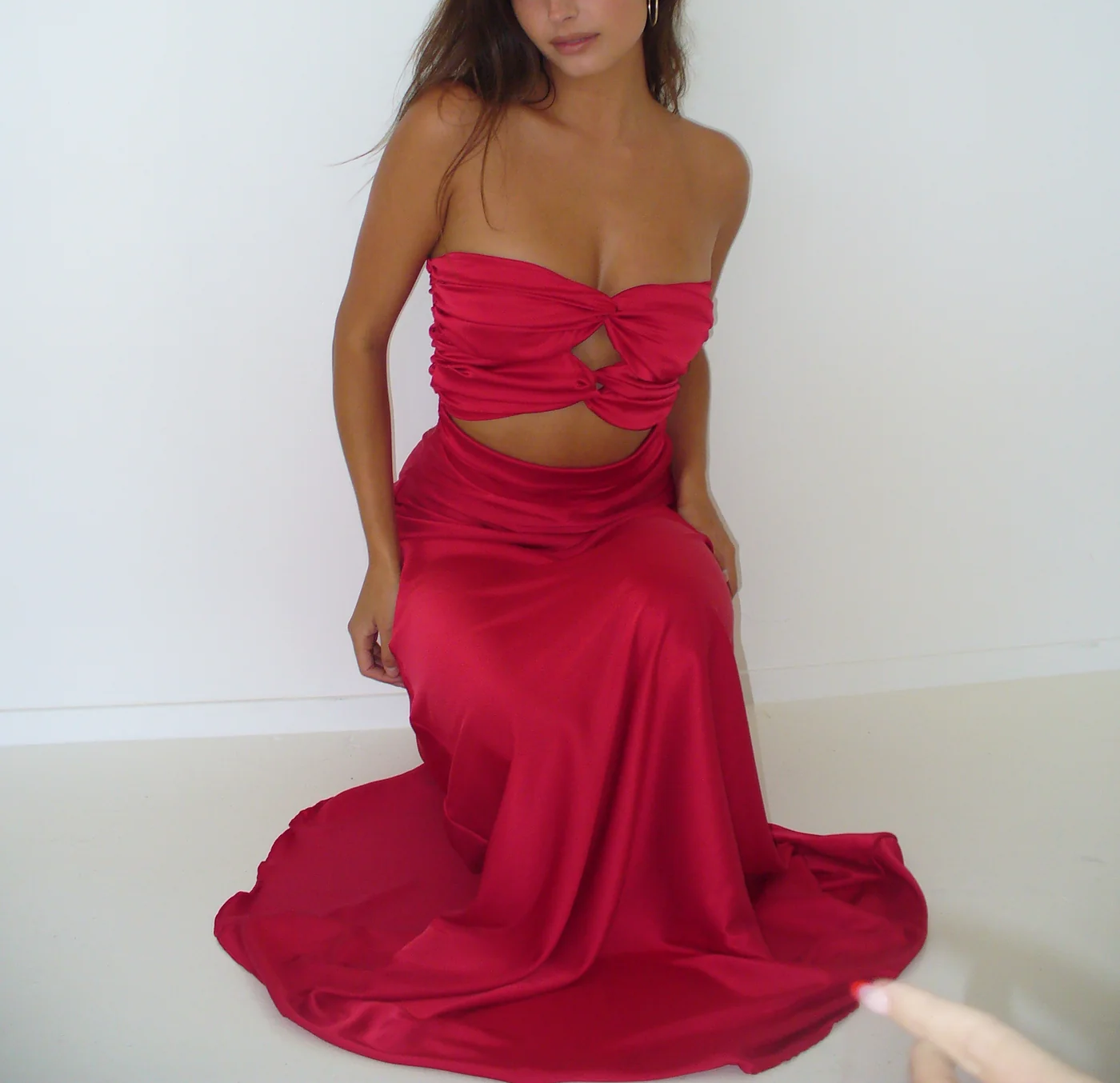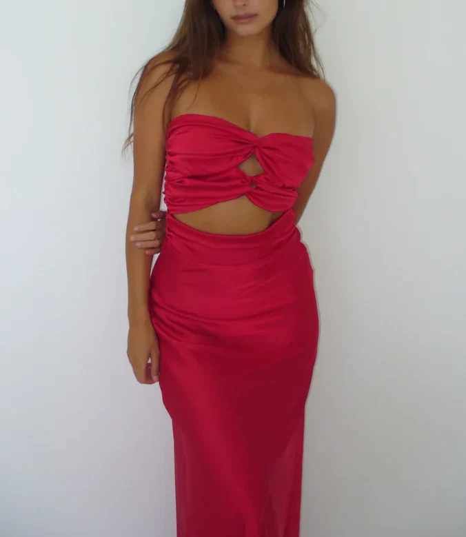 Jolie robe fourreau rouge bustier en satin, tenue de soirée longue, tenue d'anniversaire, MD7608