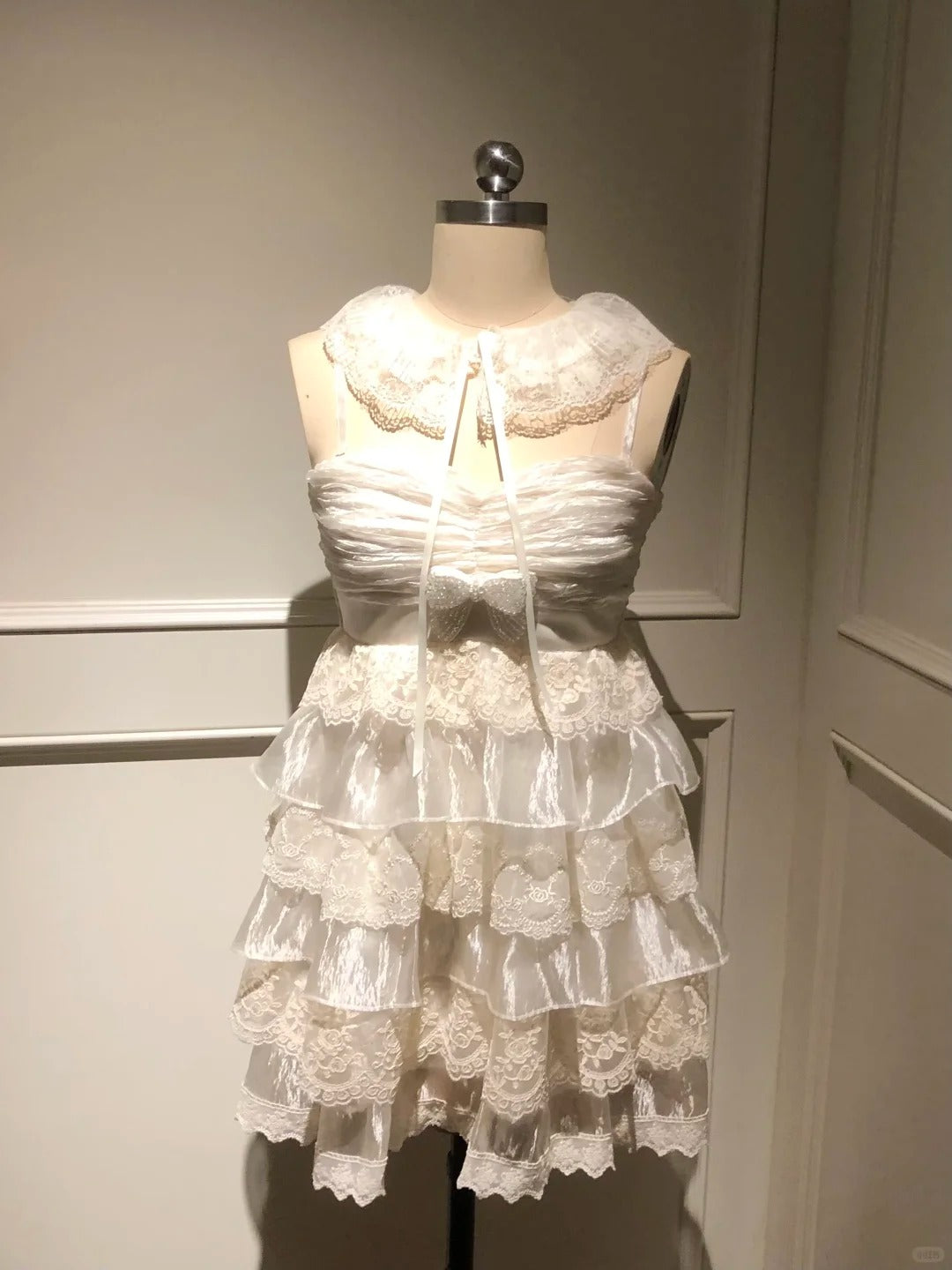 Robe de soirée élégante à bretelles spaghetti, décolleté en cœur, en organza et dentelle à volants, avec nœud papillon perlé D1784