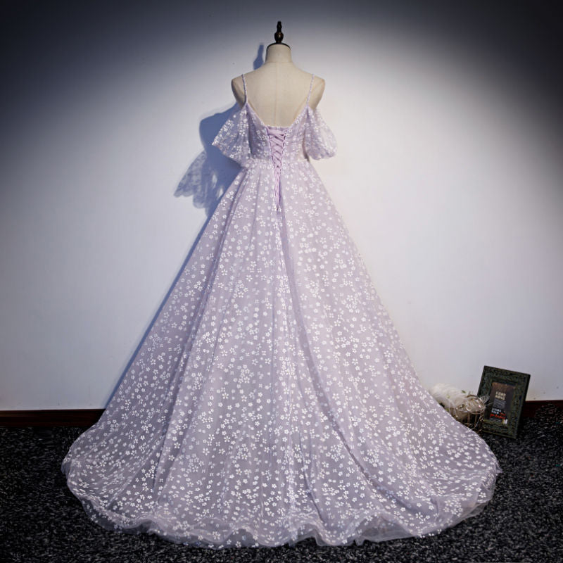 Robe de bal princesse lilas à fleurs et manches courtes M5514