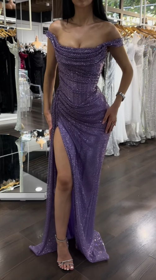 Robe de soirée longue violette à épaules dénudées et fente fourreau, D228