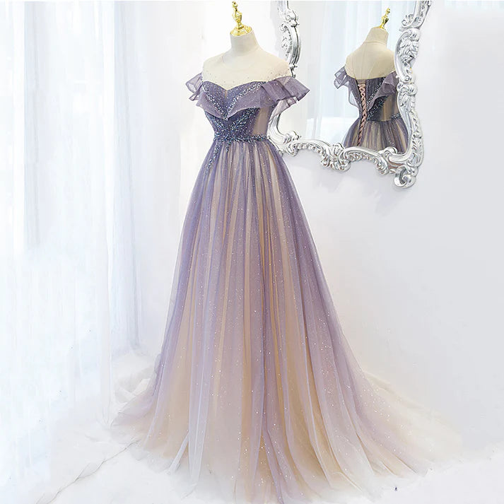 Robe de bal trapèze violette brillante en tulle, épaules dénudées, longue robe de soirée MD7564