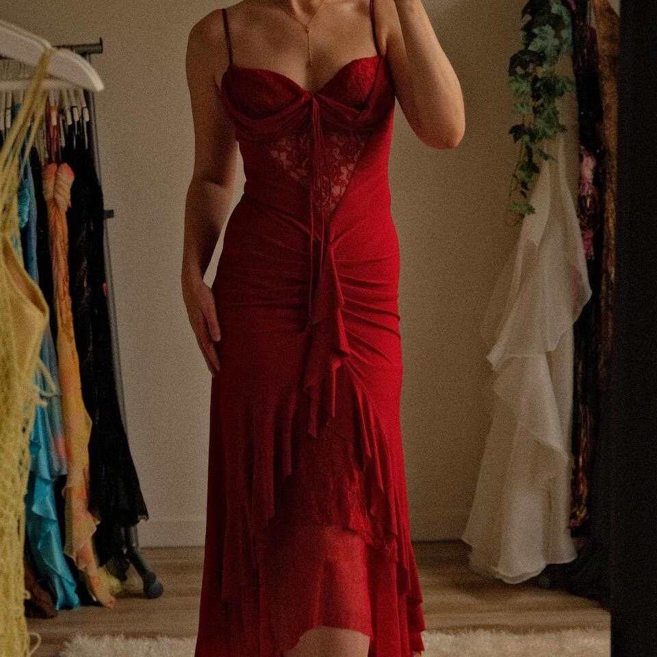Robe de soirée longue rouge à bretelles spaghetti et dentelle fourreau MD7845