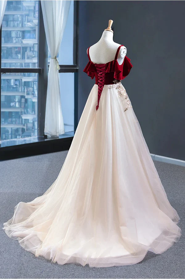Robe de soirée en tulle rouge à bretelles et appliques MD7220