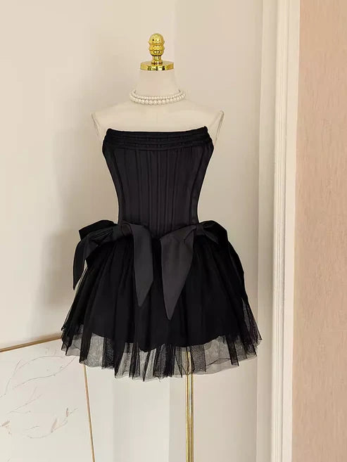 Robe de soirée courte en satin noir rétro, coupe trapèze, sans bretelles, à lacets, pour 16e anniversaire, D1531