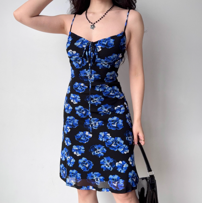 Robe rétro longueur genou à bretelles spaghetti, motif floral, tenue de vacances, de bord de mer, pour femme, D2275