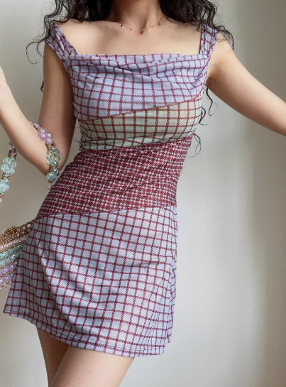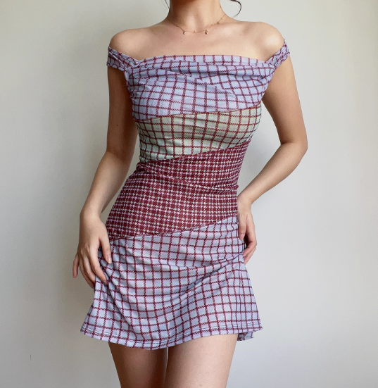 Jupe courte à carreaux style rétro à épaules dénudées pour femme et adolescente, tenue d'été pour rendez-vous D2137