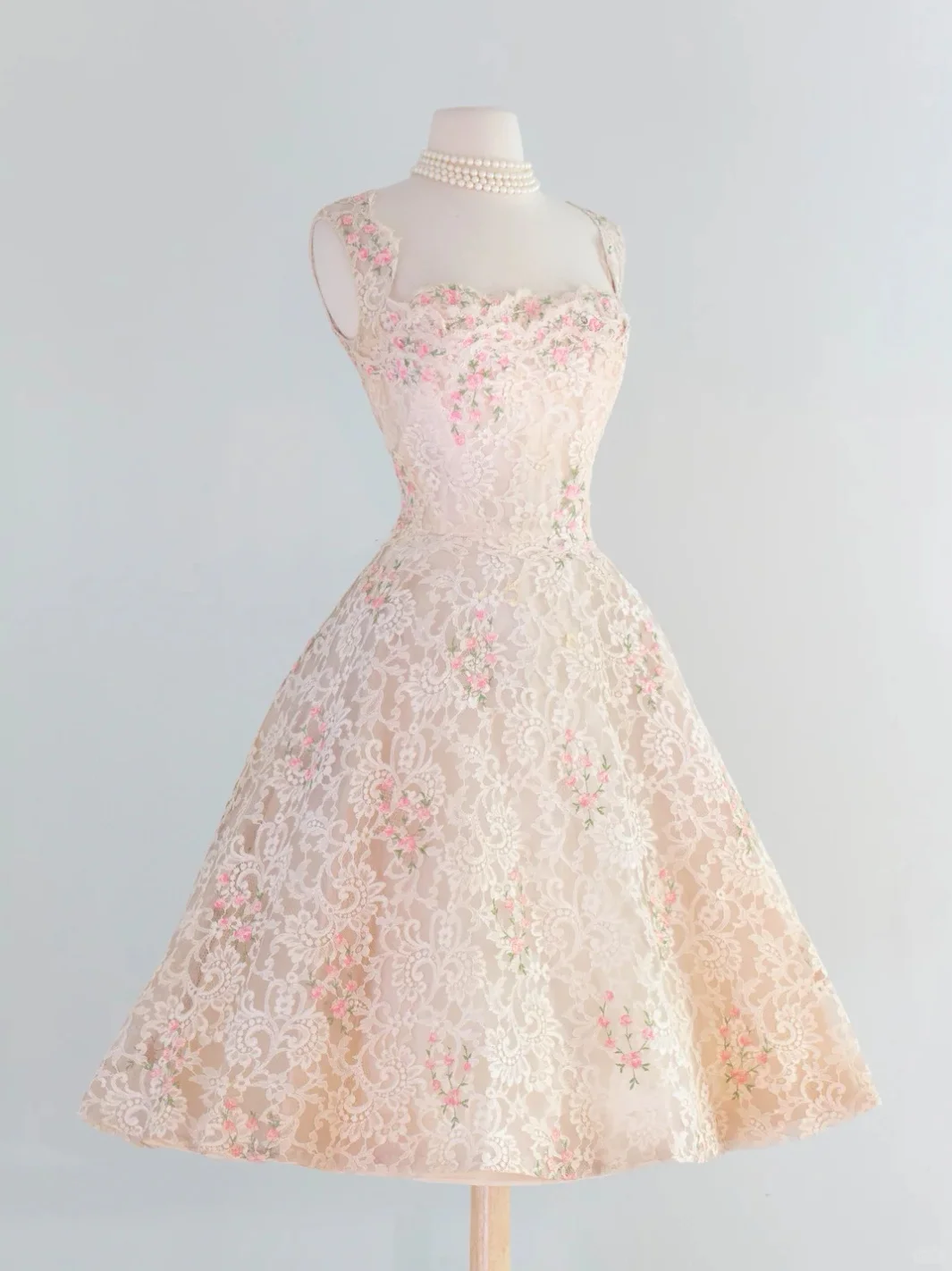 Robe de soirée courte trapèze à motif floral rétro rose, broderie exquise, robe de soirée D1670