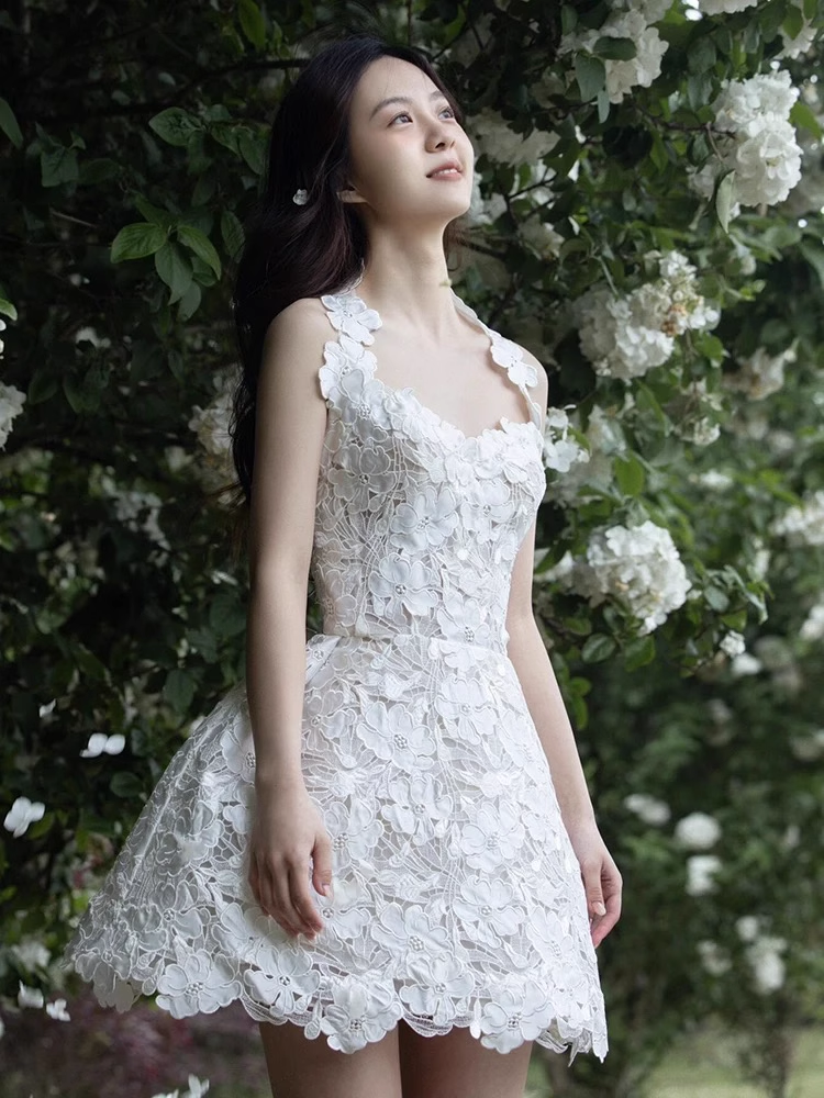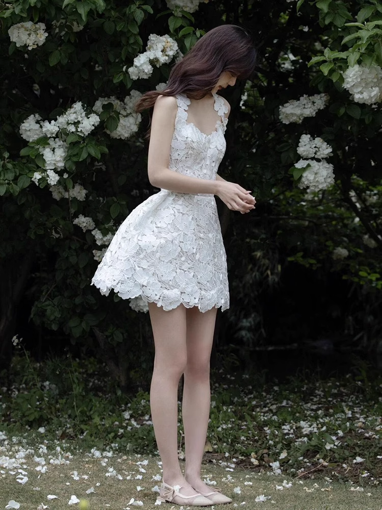 Robe de soirée trapèze blanche rétro sans manches avec appliques D1442