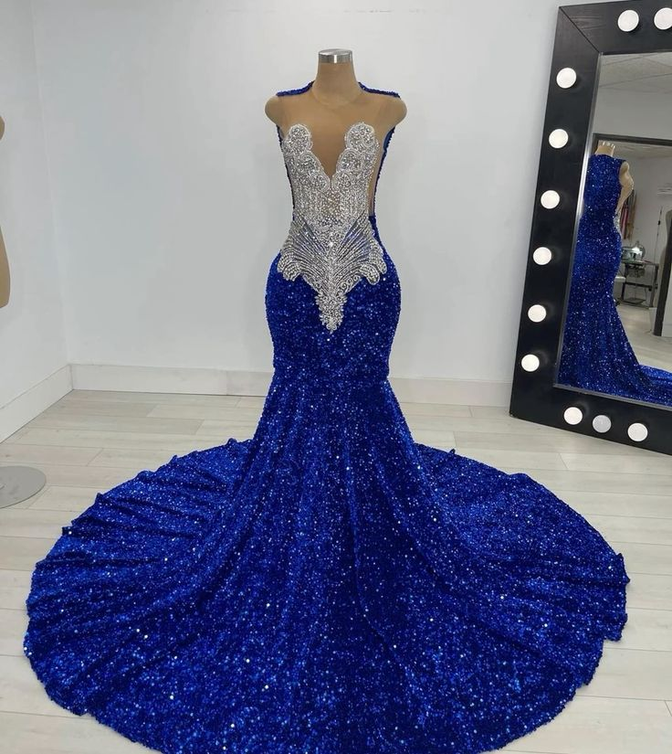 Robe de soirée longue sirène noire à paillettes bleu roi pour fille MD7469