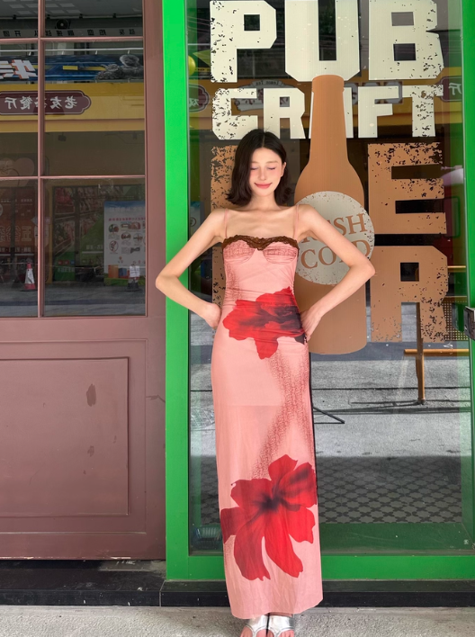 Robe d'été en maille pour femme, jupe longue plissée à la cheville, bretelles spaghetti, imprimé dentelle, bord de mer, D1885