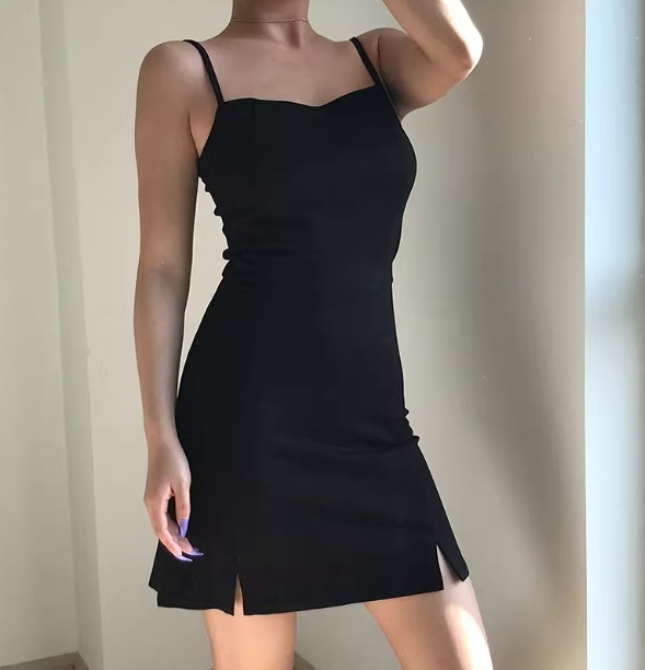 Robe fourreau noire sexy à bretelles spaghetti et fente pour adolescentes, tenue d'été pour les vacances et les rendez-vous, D2100