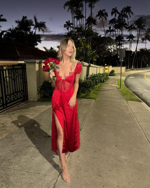 Robe de soirée longue en satin et dentelle rouge sexy à col en V et manches courtes MD7825