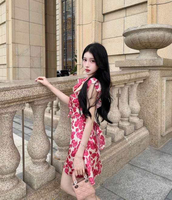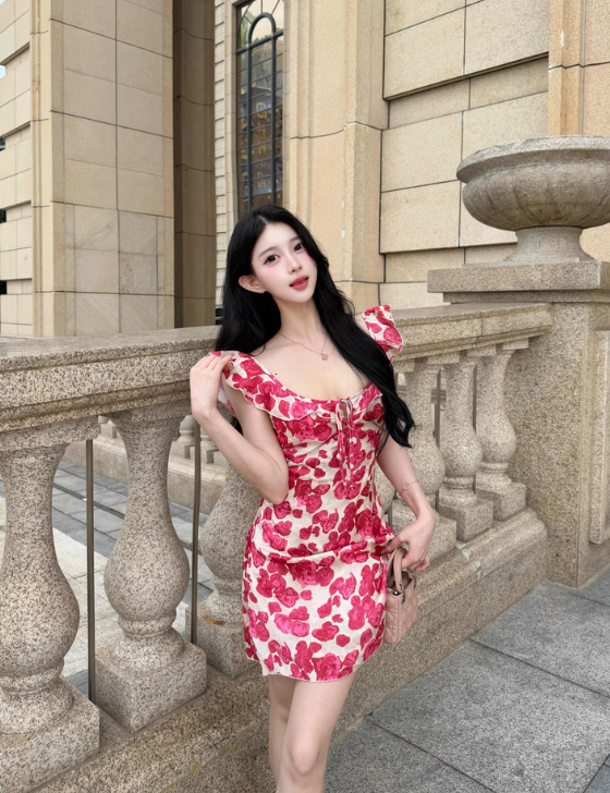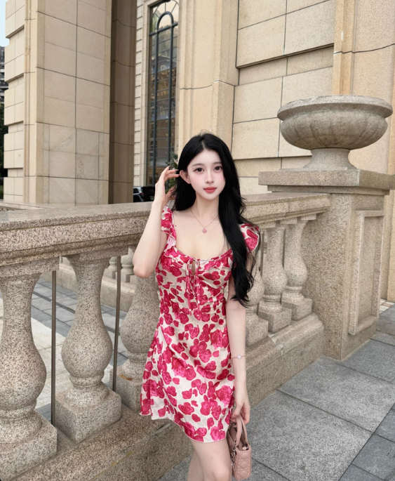 Robe courte sexy en dentelle avec bretelles et lacets, style bord de mer, imprimé rose, tenue de soirée, D1791
