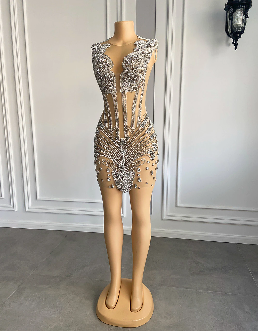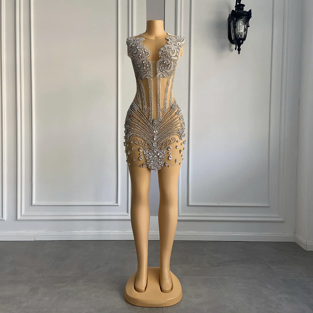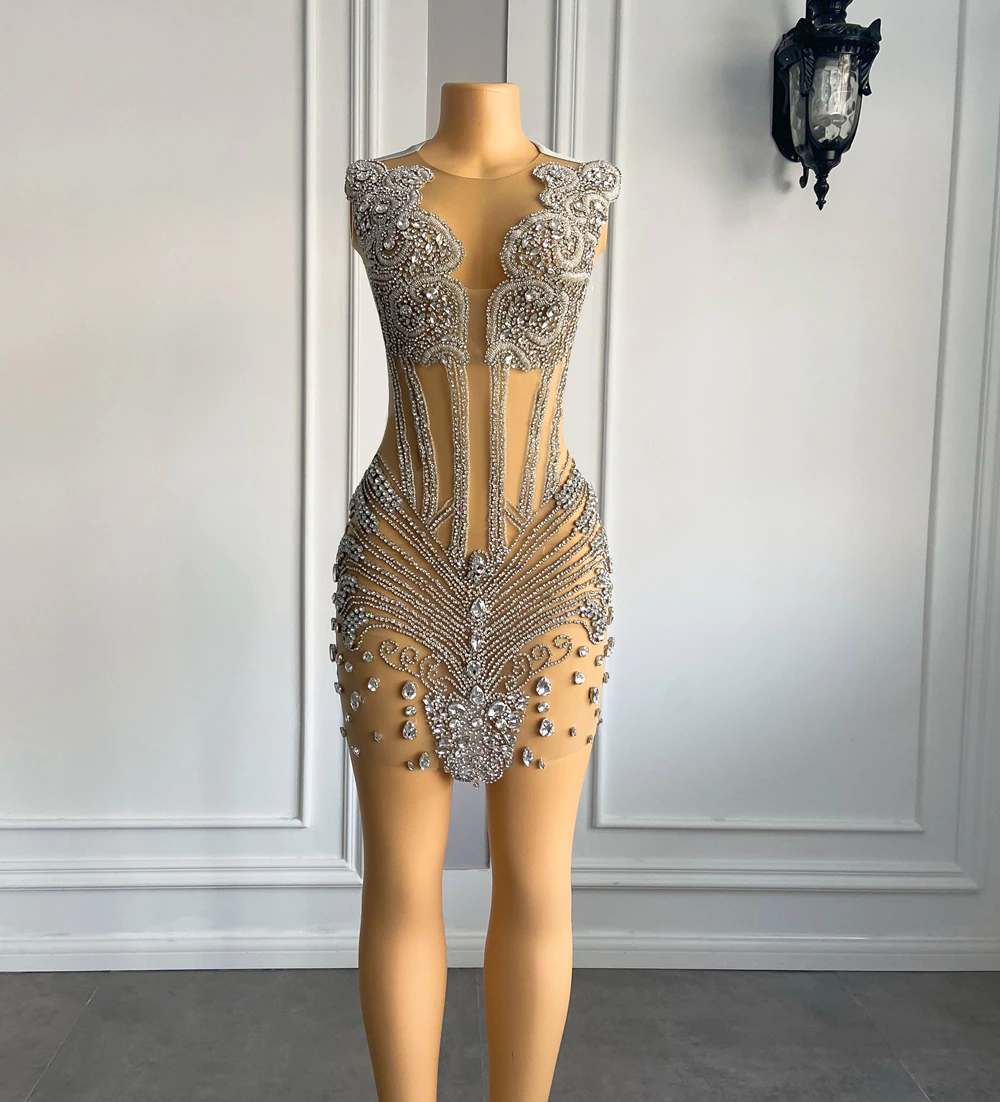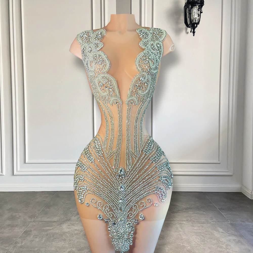 Robe de bal courte et sexy noire transparente, luxueuse, scintillante, argentée et diamantée, idéale pour un cocktail ou une fête d'anniversaire, MD6933