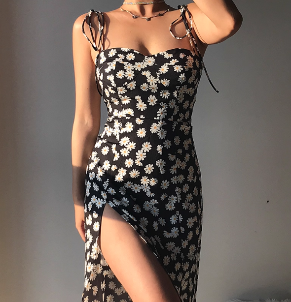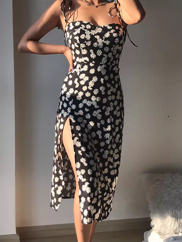 Robe d'été sexy à bretelles spaghetti et jupe fendue à fleurs pour femme, tenue de vacances en bord de mer D2092