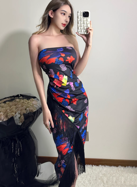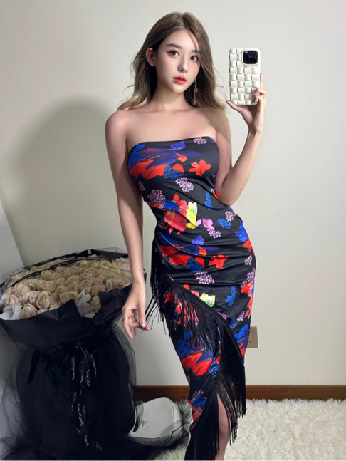 Robe longue sexy sans bretelles avec pompons et jupe longue à col licou, tenue de soirée d'été pour femme D1826