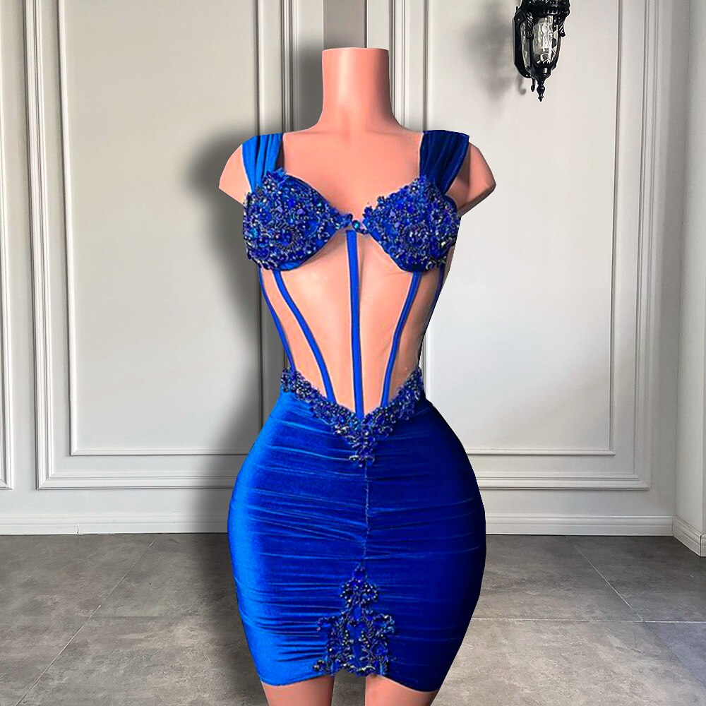 Robe de bal courte transparente, décolleté en cœur, perles et cristaux, bleu roi, robe de cocktail pour femme, fête d'anniversaire, MD6951, 2022