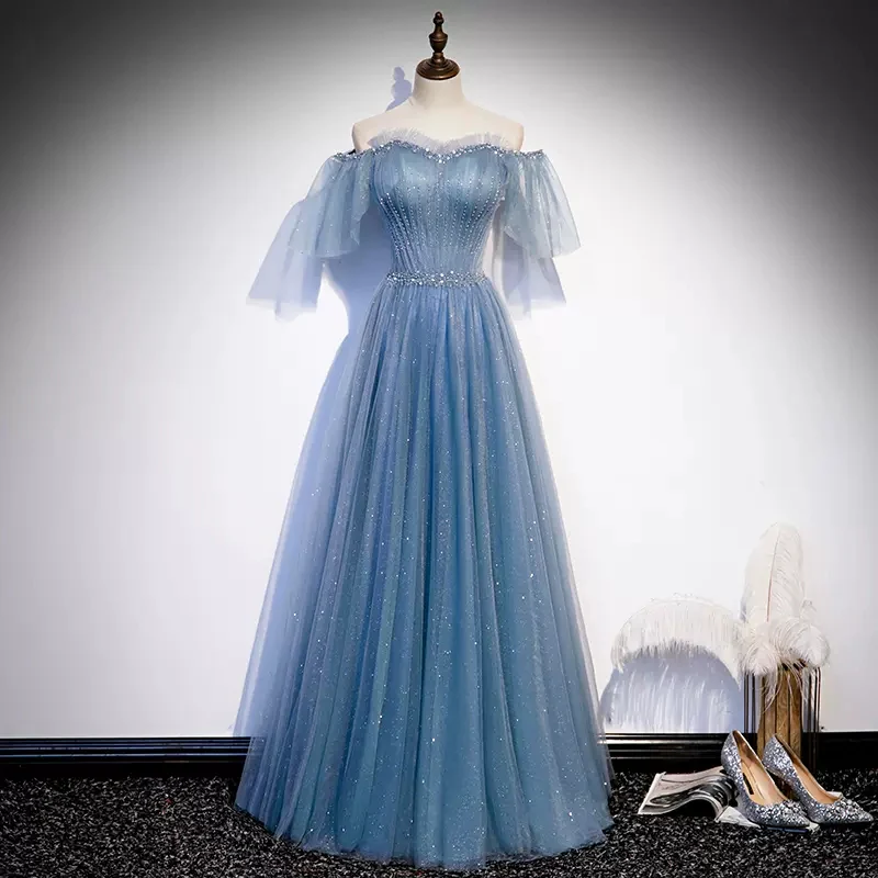 Robe de soirée bleu brillant à épaules dénudées et perles en tulle MD7177
