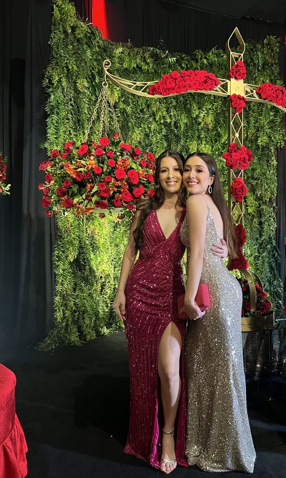 Robe de soirée longue fourreau fuchsia brillante à col en V et paillettes MD7349