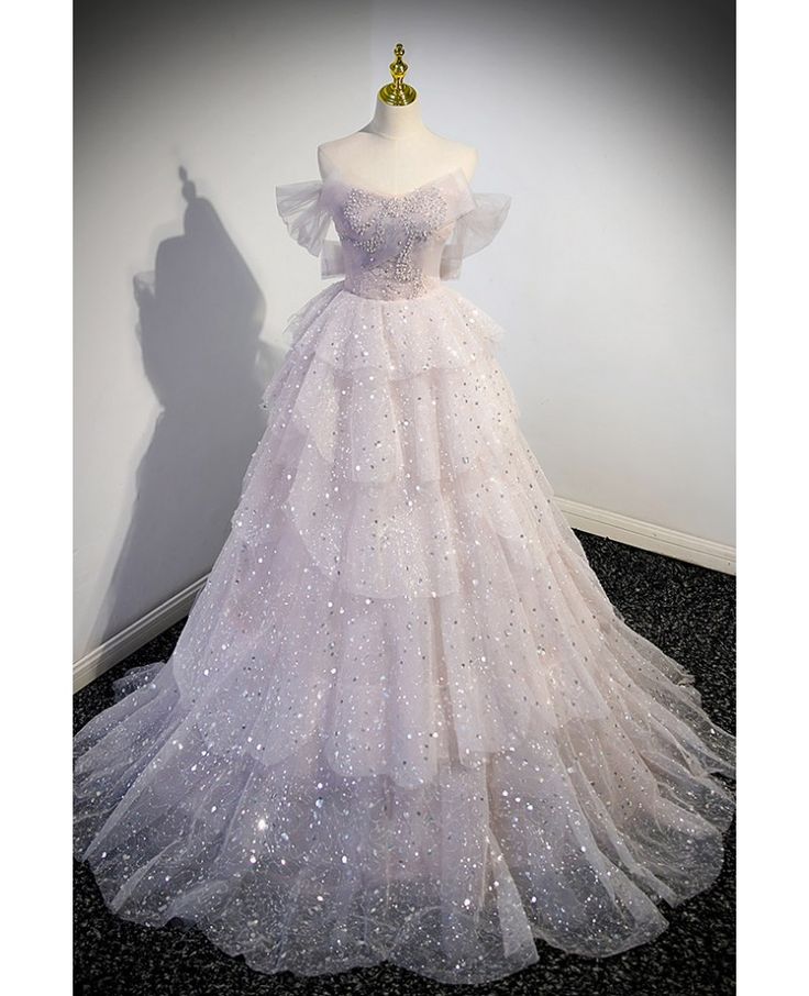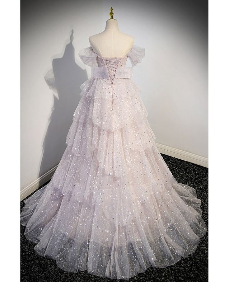 Robe de soirée longue en tulle brillant à épaules dénudées et à volants, coupe trapèze, MD7777