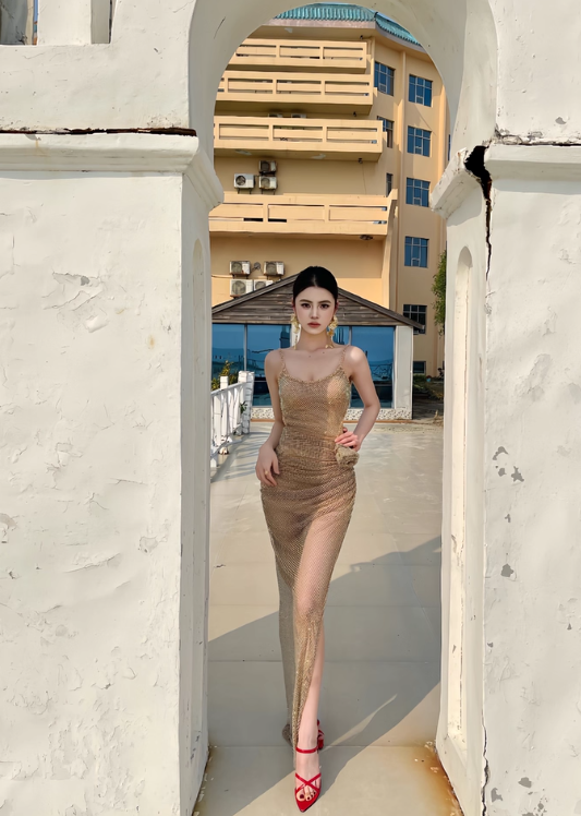 Robe fourreau plissée à bretelles spaghetti brillantes, faite à la main, robe longue de soirée d'anniversaire, robe de bal de gala D1793