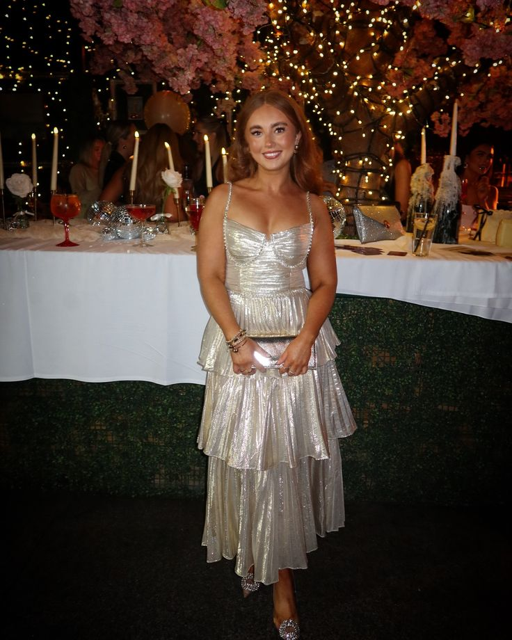 Robe de soirée longue argentée à bretelles spaghetti, coupe trapèze et volants, MD7473