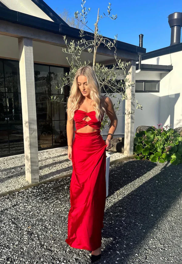 Robe de soirée longue en satin rouge simple, sans bretelles, MD7592