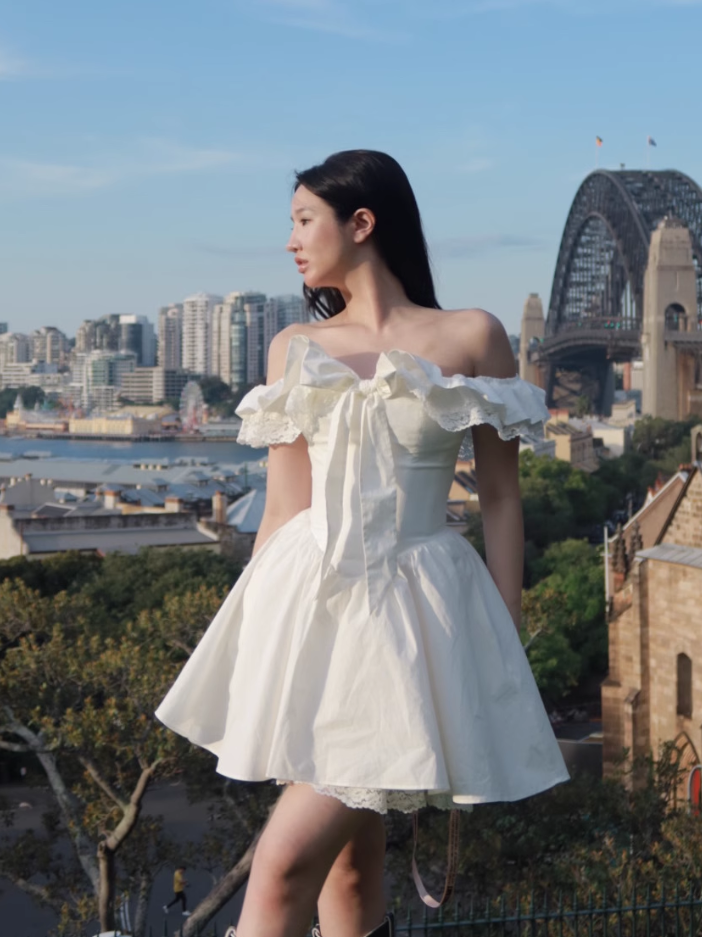 Robe de soirée trapèze blanche simple à épaules dénudées et nœud en dentelle, D1374