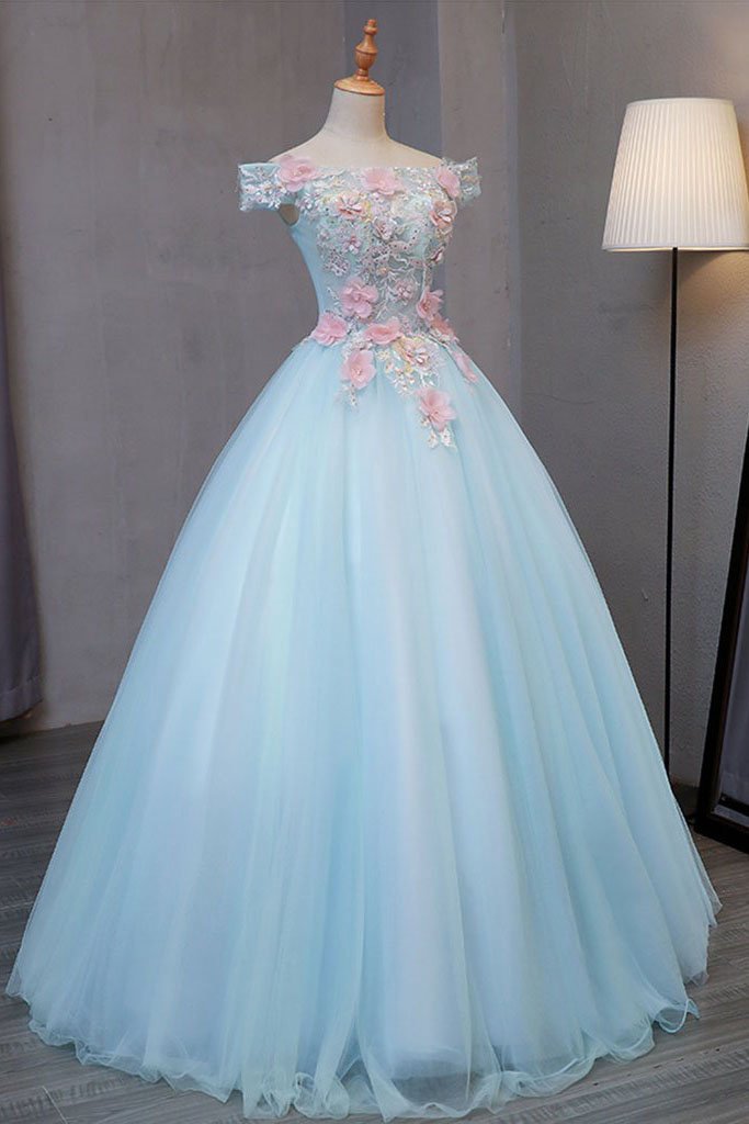 Robe de bal longue princesse bleu ciel en tulle à épaules dénudées, robe de Quinceanera à fleurs M1763