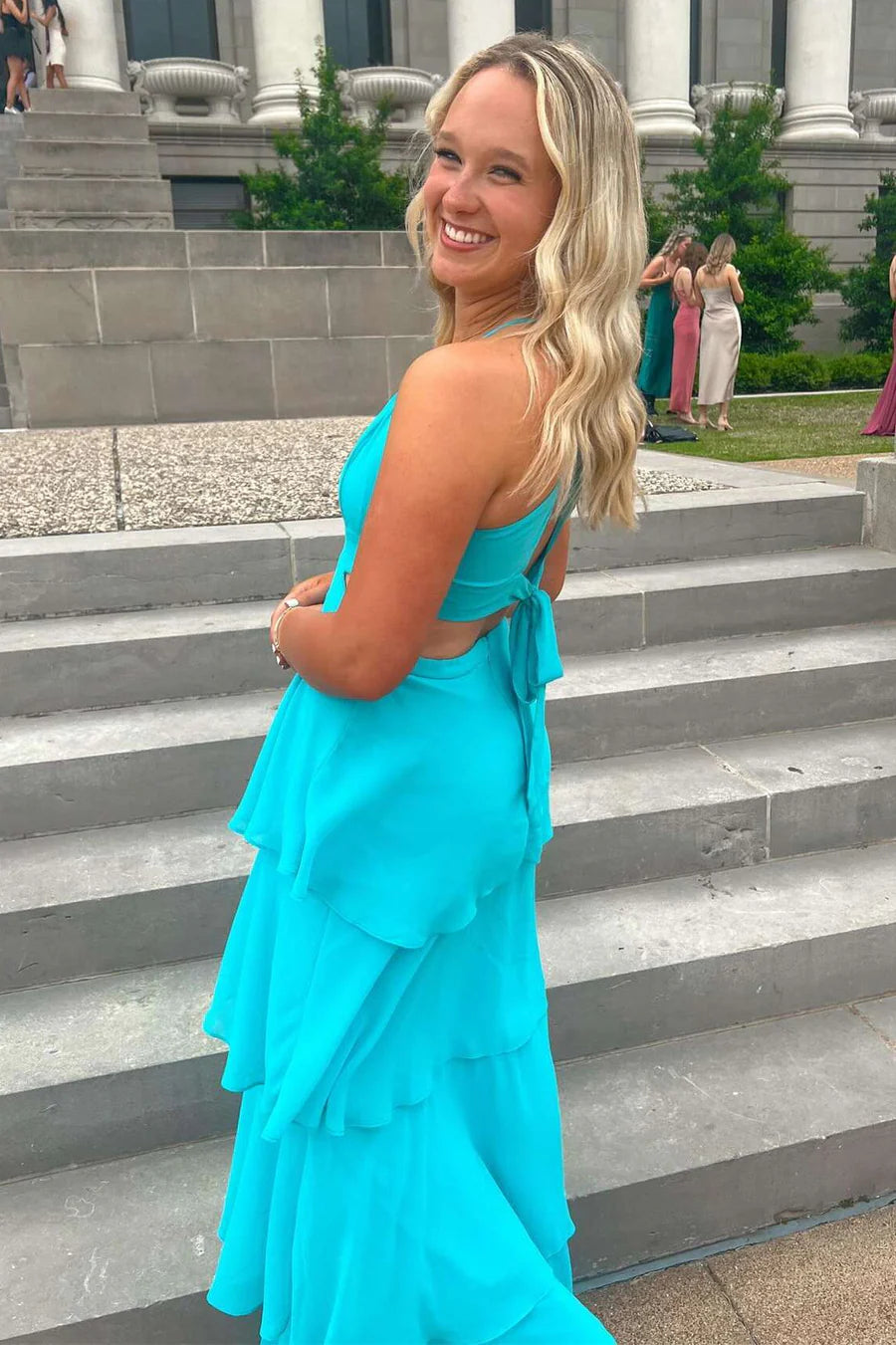 Robe de soirée en mousseline à bretelles spaghetti et col en V, sans manches, à volants, MD7741