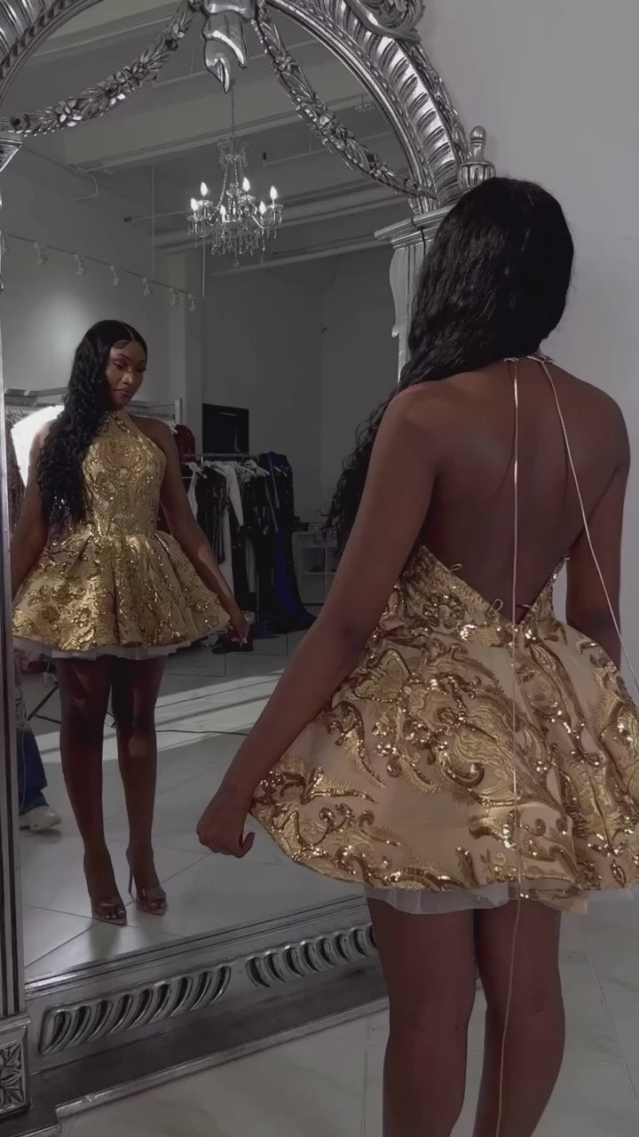 Robe licou brodée de sequins dorés scintillants, coupe trapèze, avec appliques, robe de soirée, robe de bal D1586