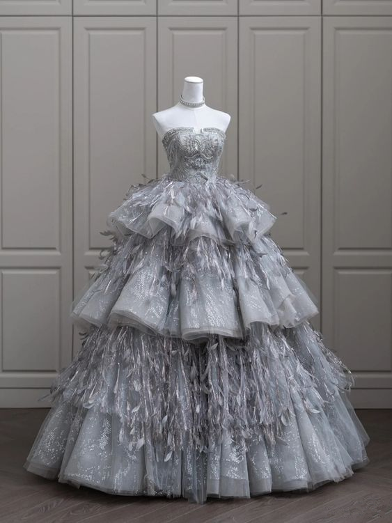 Superbe robe de bal longue argentée bustier, coupe trapèze, à volants, pour anniversaire, MD7453