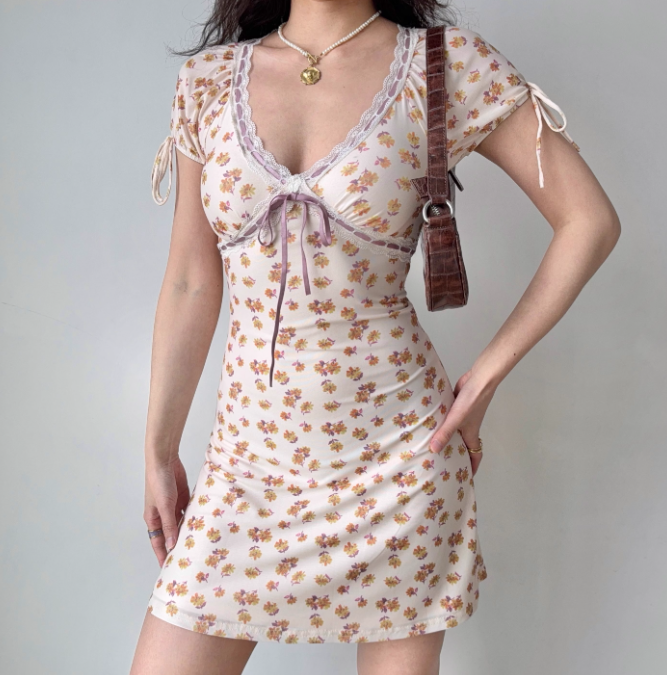 Robe élégante pour femme, col en V, dentelle, imprimé floral, jupe courte, robe pour adolescente, robe de rendez-vous, D2272