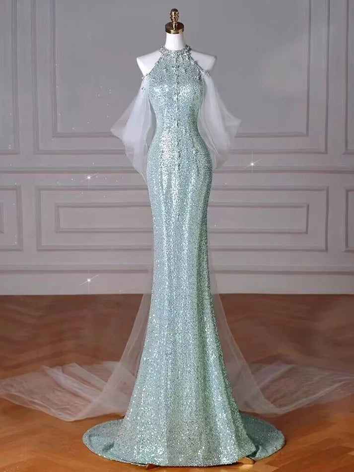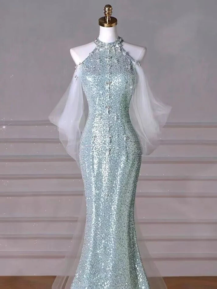 Robe de bal longue sirène à paillettes bleu Tiffany MD7649