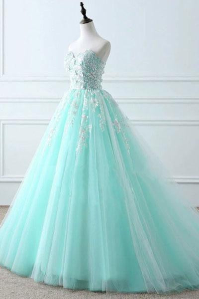 Robe de bal bouffante en tulle bleu Tiffany, décolleté en cœur, avec appliques en dentelle, longue robe de remise de diplôme M1913