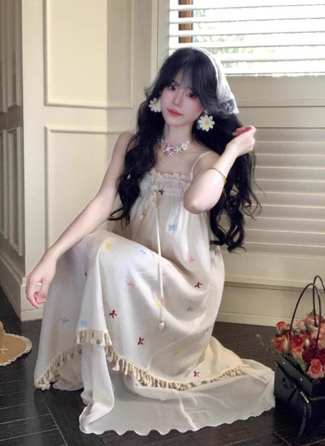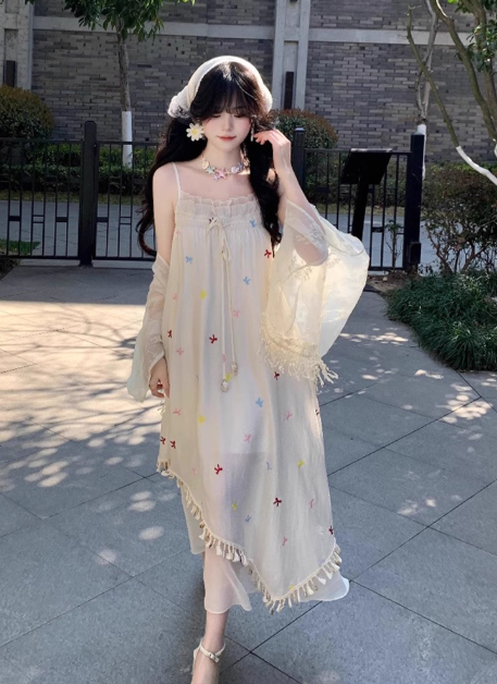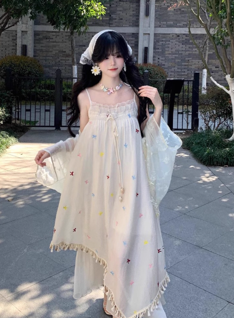 Robe longue d'été à bretelles spaghetti, plissée, nœud papillon, brodée, ourlet asymétrique, pour femme, D2000