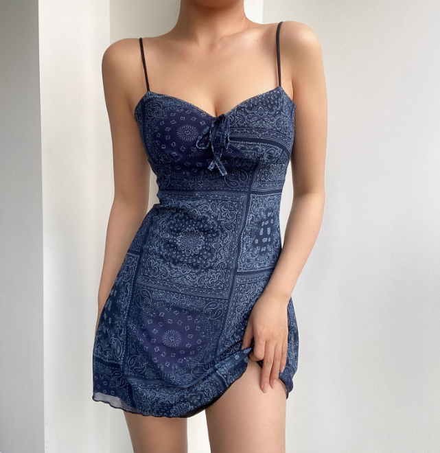 Robe de plage d'été à bretelles spaghetti et jupe courte en tulle imprimé pour femme, tenue de rendez-vous, D2052