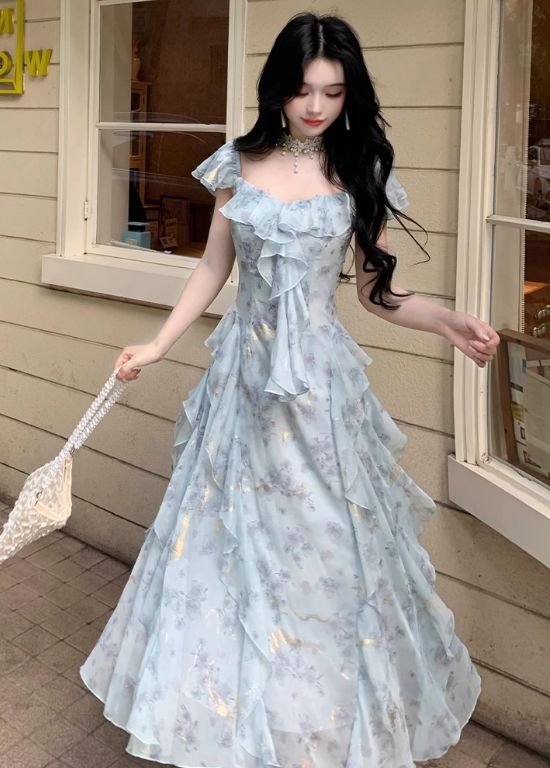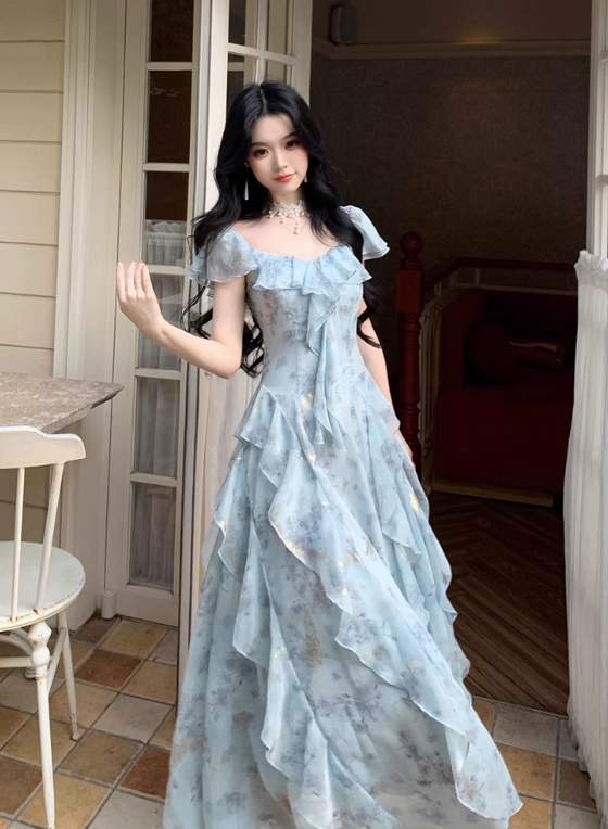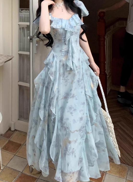 Robe longue à volants et imprimé floral pour femme, tenue d'été à col carré et col carré, idéale pour la plage, D2217