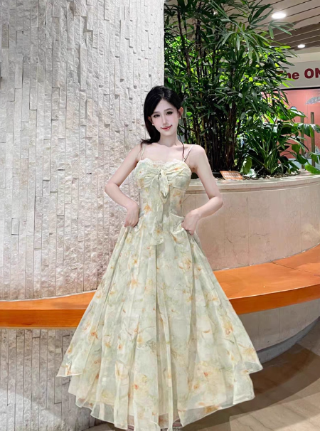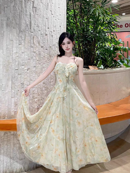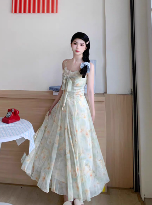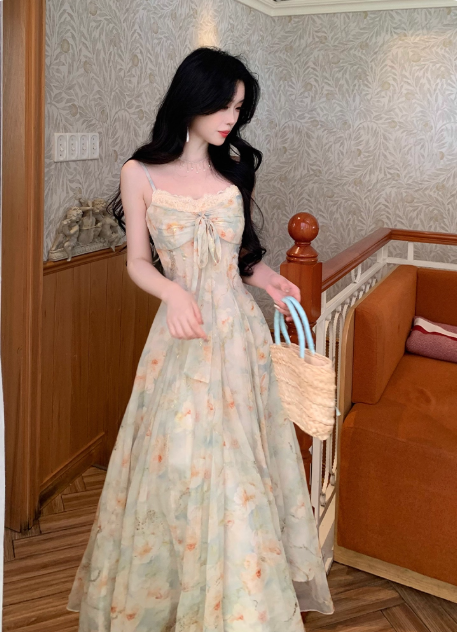 Robe longue plissée à fleurs et bretelles spaghetti polyvalentes, col en dentelle, robe de vacances d'été pour femmes D2003