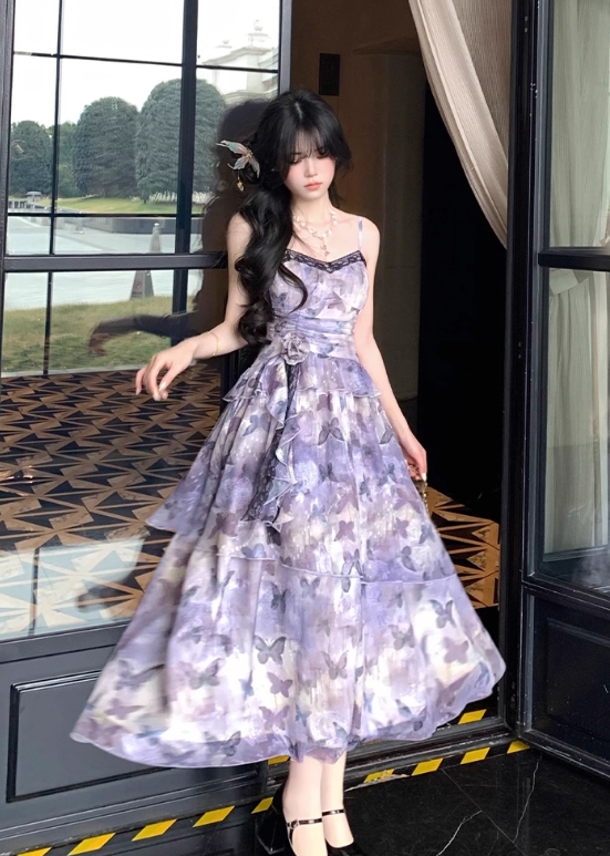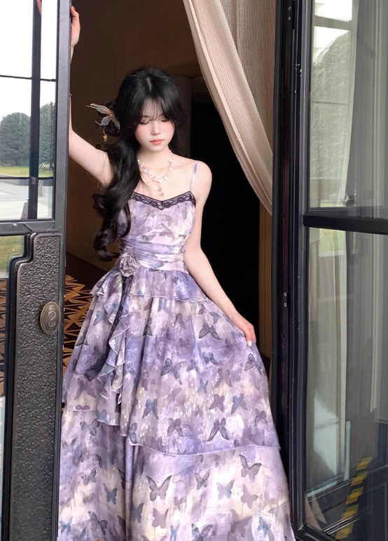 Robe longue polyvalente à bretelles spaghetti, en dentelle, imprimé papillon, plissée, à volants et à volants, robe d'été pour femme D1993
