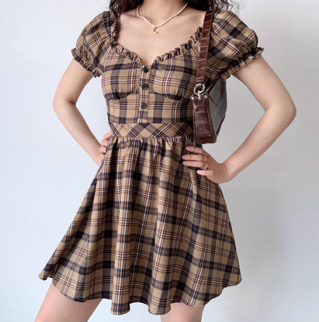 Robe d'été polyvalente, coupe trapèze, à carreaux, manches bouffantes, jupe courte, pour femme, adolescente, robe de rendez-vous, D2328