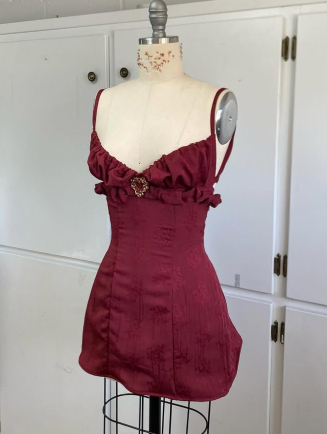 Robe de soirée courte vintage bordeaux à bretelles spaghetti, coupe trapèze, à lacets, robe de bal, D1326